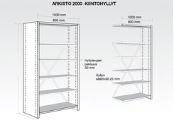 Vapaasti lattialla seisovat levypäätyrakenteiset kiintohyllyt. Kiintohylly on mahdollista myöhemmin nostaa siirtovaunujen päälle.